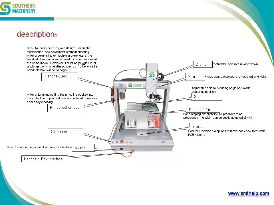 The cutter body and head are independently developed, and are more suitable for automatic cutting of PCBA lead. Applicable cutter heads can be designed according to different products. The cutter head is made of tungsten steel, which is more neat and durable.